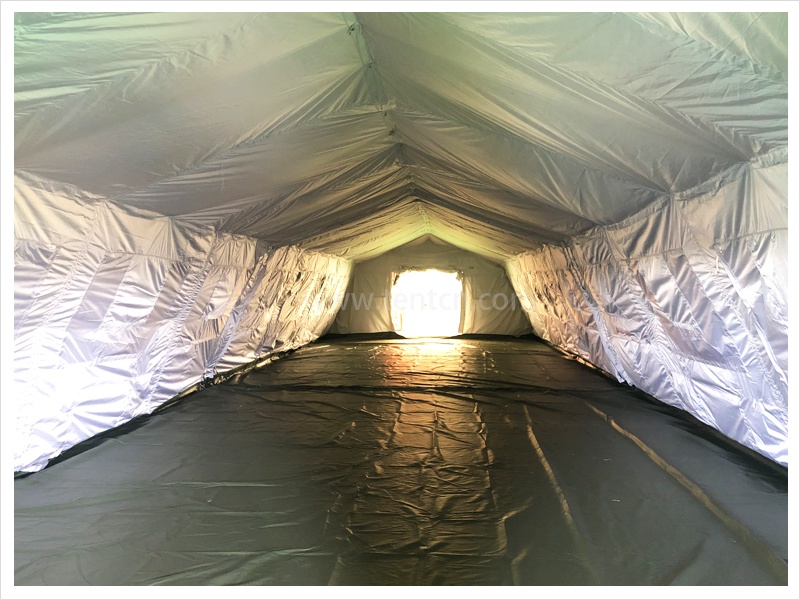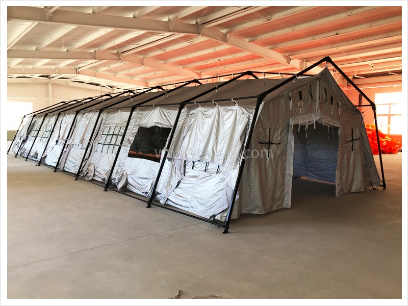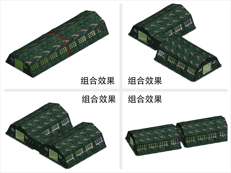 帳篷為斜坡式、外篷雙層結(jié)構(gòu),夏季隔熱、通風(fēng)性能良好,冬季保溫、密封性能良好。篷架采用榀架折疊、橫桿插接機(jī)構(gòu),零部件品種少,易于管理。篷體窗墻面積比大,室內(nèi)通風(fēng)采光良好,篷體設(shè)有斜拉式窗蓋和遮篷式通風(fēng)窗蓋,遮陽、遮雨功能良好。帳篷配有防潮地布、防蚊紗門和紗窗,居住性好。帳篷可以多方式任意組合聯(lián)接。
